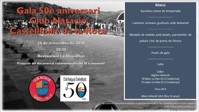 com ja sabeu enguany el Club Natació Castellfollit celebre els seus 50 anys d'història. Per aquest motiu, i com a acte central, el Club organitza pel proper dissabte 24 de novembre a les 20:30 h. el "SOPAR DE GALA DEL 50è ANIVERSARI DEL CLUB NATACIÓ CASTELLFOLLIT" que tindrà lloc al Restaurant "La Deu" d'Olot.